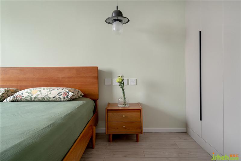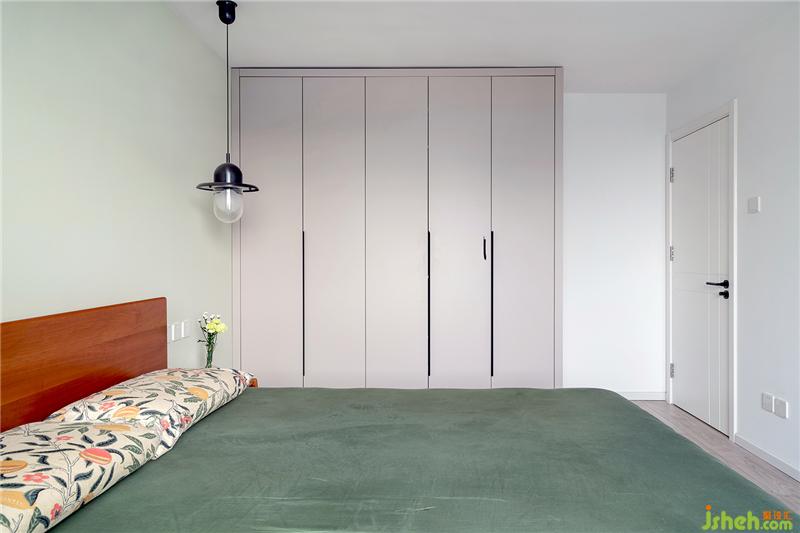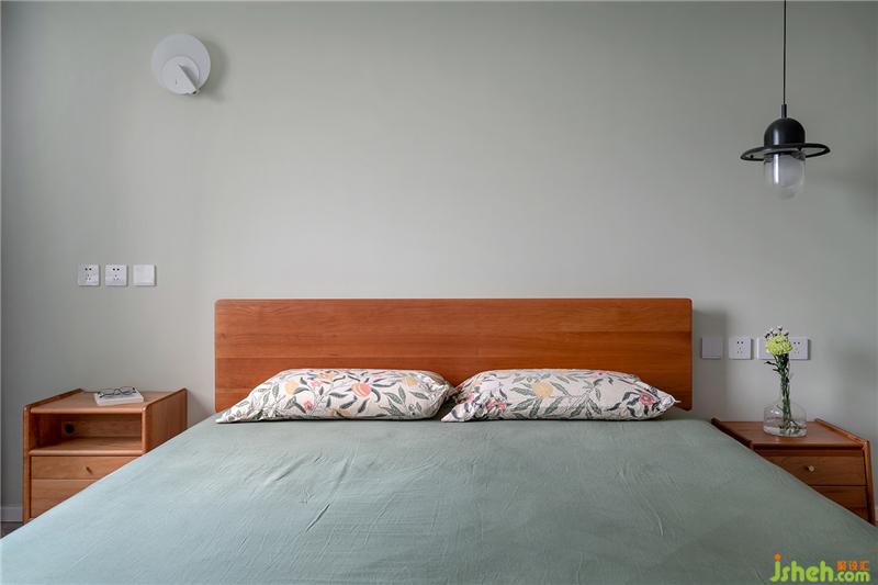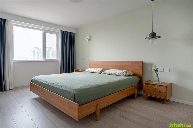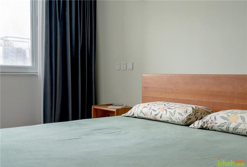 淺色的木地板通鋪到臥室,灰綠色的墻面與櫻桃木的床體相呼應(yīng),讓整個空間更加自然。
