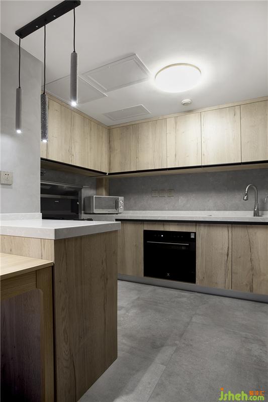 開(kāi)放式的廚房,原來(lái)在水盆的左上方是有窗戶的,但是基本沒(méi)有采光,所以干脆就堵上了,這樣吊柜也可以多一些,通風(fēng)不用擔(dān)心,家里安裝了全屋的新風(fēng)系統(tǒng)。