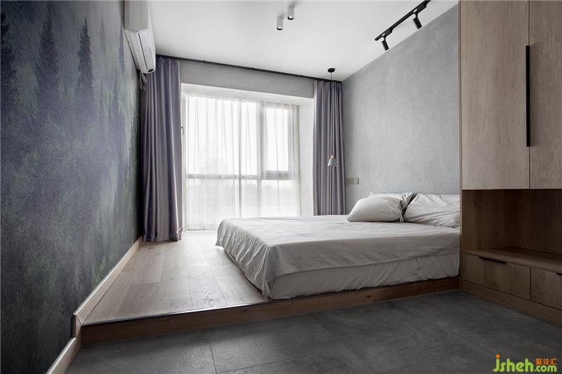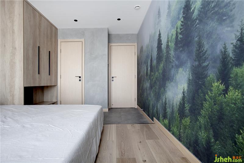 床正對(duì)面設(shè)計(jì)了一面森林壁畫,加大了屋里的視覺(jué)感,同樣也提升了整體氛圍,大自然的魅力是永不過(guò)時(shí)的。