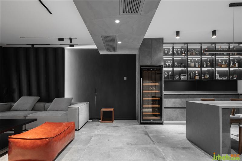 內(nèi)嵌中央空調(diào)與筒燈的吊頂部分涂刷了水泥漆,與水泥灰色地磚地面交相呼應(yīng),有效的劃分出餐廳與客廳空間。