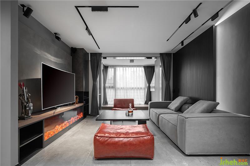 到頂?shù)暮谏珜?shí)木造型板用做沙發(fā)的背景墻,板面經(jīng)過開槽加工處理,側(cè)邊安裝線性燈帶,具有科技感。