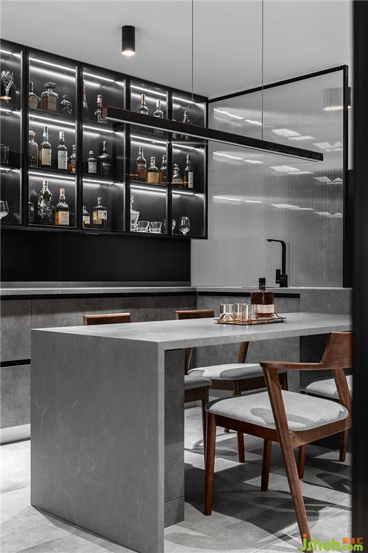 Mr.尹有很多藏酒,所以在西廚臺面上方做了大量的酒架,為了便于打理安裝了玻璃材質(zhì)的柜門,柜內(nèi)安裝燈帶照明,各式酒類琳瑯滿目,實(shí)用與美觀的廉顧得以完美體現(xiàn)。