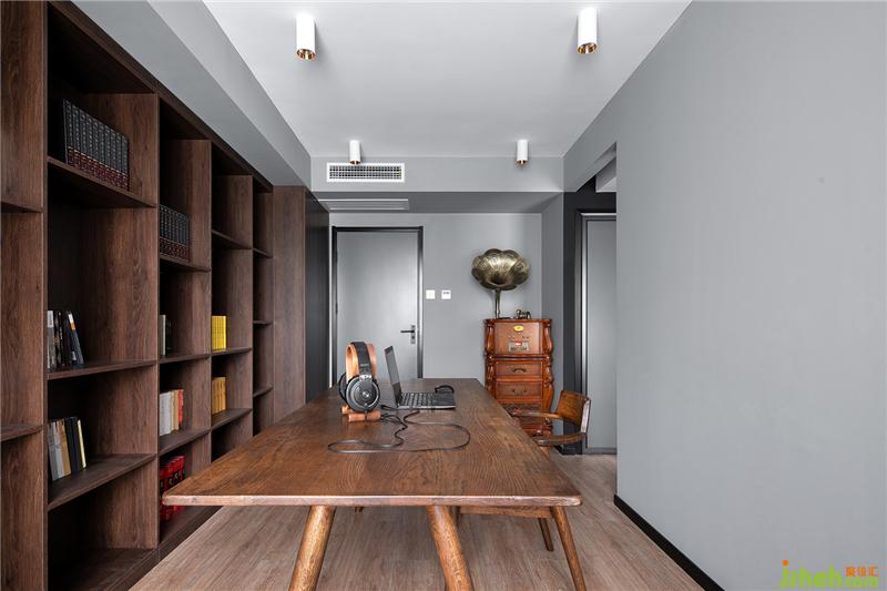 書房區(qū)域一側(cè)做了整面墻深胡桃木色收納柜,中間部分定制為開放格書架,使業(yè)主收藏的大量書籍得以擺放。復(fù)古的唱片機(jī)放置在書房的一角,聆聽舒緩的音樂,洗去工作后一身的疲憊。