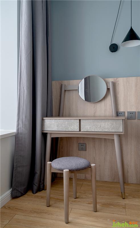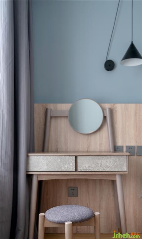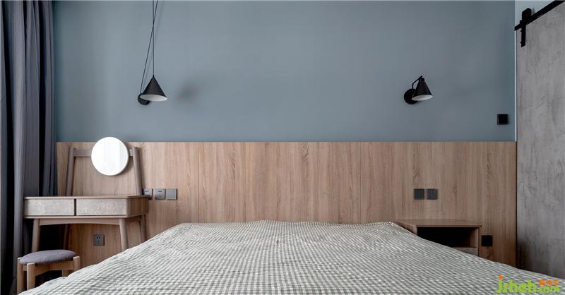 臥室床頭角度,床頭燈具和木色背板,形成高低錯(cuò)落的層次關(guān)系?;宜{(lán)色墻面,有助讓空間實(shí)現(xiàn)擴(kuò)張的效果。
