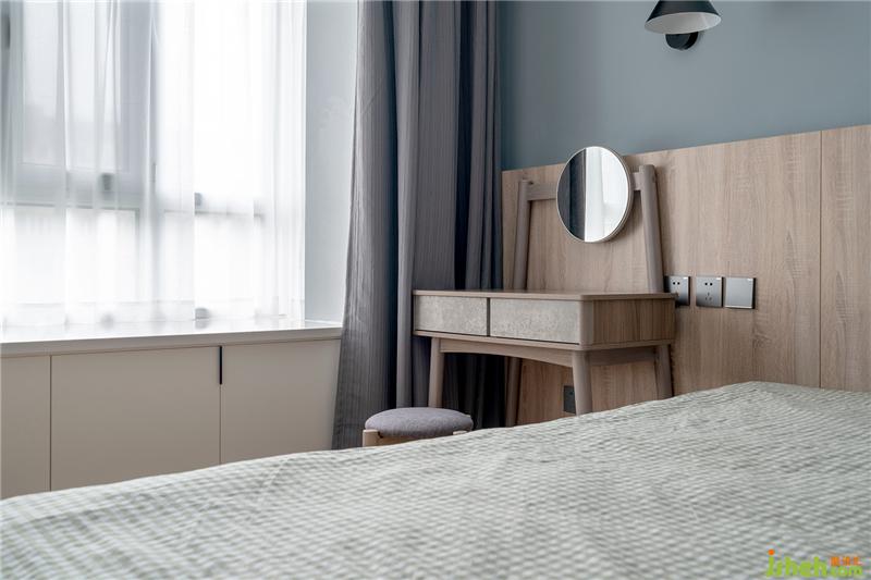 妝臺(tái)一角,飄窗底下的儲(chǔ)物柜體,分擔(dān)了臥室的一部分儲(chǔ)物功能。