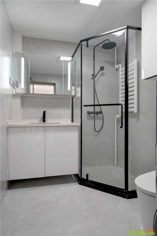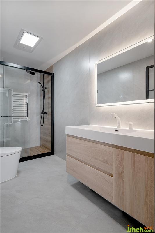 主衛(wèi)除了淋浴房區(qū)域,使用木紋磚上墻,其它部分,大多以灰色為主。淋浴,以及浴室柜的木色提升衛(wèi)生間的“溫度”。