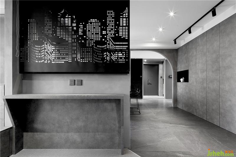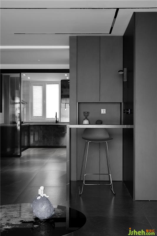 吧臺后方利用墻體做了到頂?shù)氖占{柜,中間留空部分可放置一些小擺件,儲物功能多樣化。石材吧臺與啞光石材地面反射出的光影給人帶來一絲高冷的氣息。