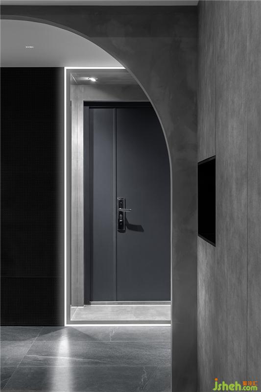 虛虛實實的光影交織在空間中,與玄關(guān)處硬朗的矩形線條相呼應(yīng)勾勒出深邃而高級的氣場。