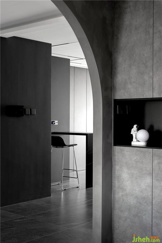 通往房間內(nèi)部的埡口半弧形的設(shè)計,過度兩個功能區(qū),利用不同的線條造型,讓空間擁有與眾不同的氣質(zhì)。