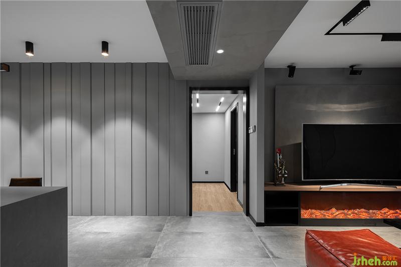 到頂?shù)暮谏珜嵞驹煨桶逵米錾嘲l(fā)的背景墻,板面經(jīng)過開槽加工處理,側(cè)邊安裝線性燈帶,具有科技感。