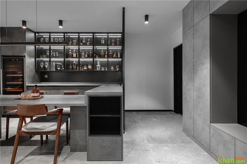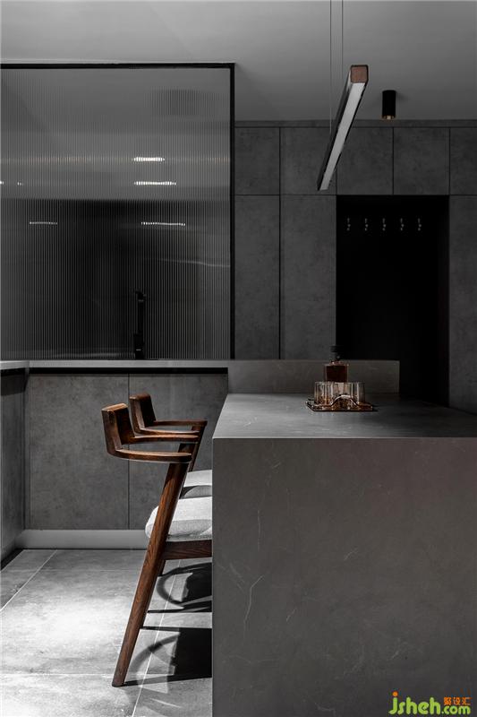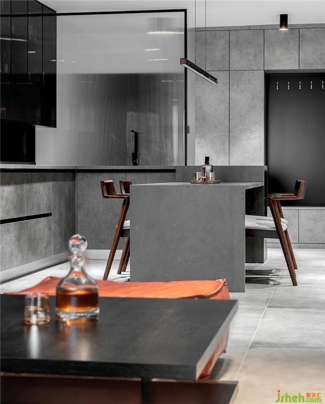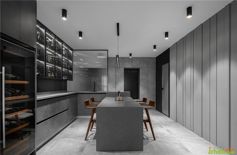 餐廳區(qū)域利用過道空間設計一處西廚區(qū),與就餐島臺融為一體,洄游動線讓空間交通無阻礙。
