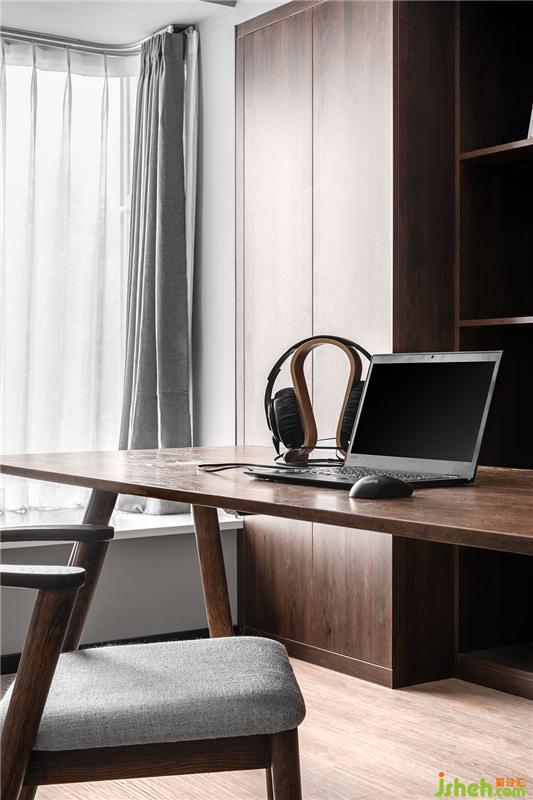 書房區(qū)域一側(cè)做了整面墻深胡桃木色收納柜,中間部分定制為開放格書架,使業(yè)主收藏的大量書籍得以擺放。