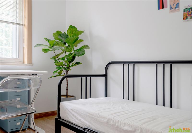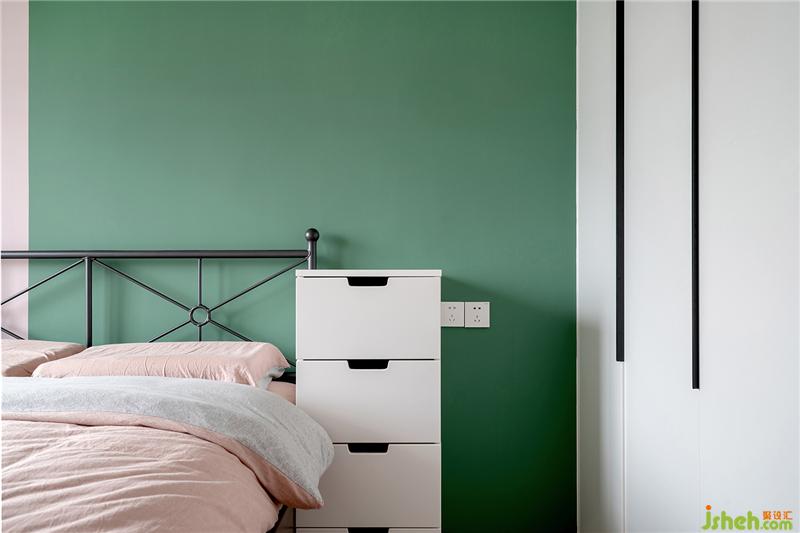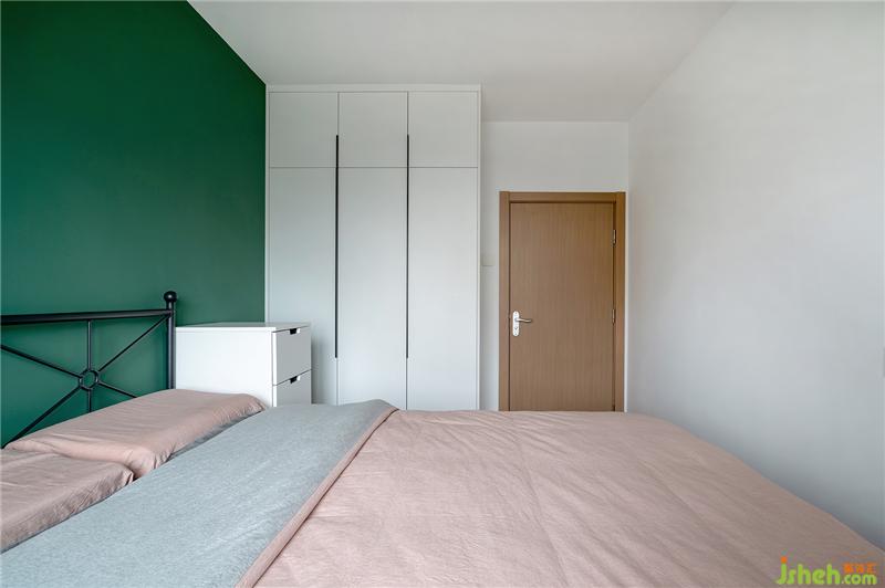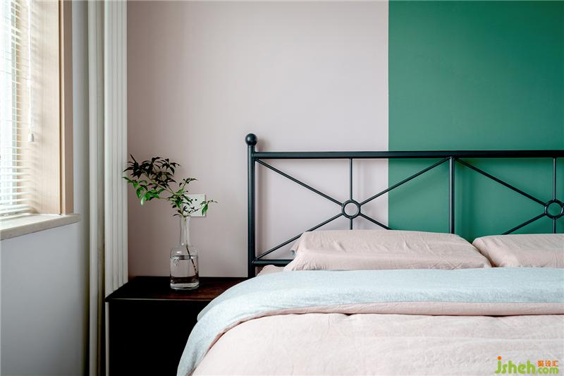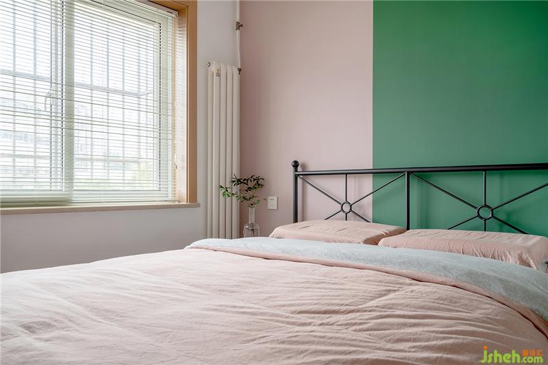 臥室床是宜家款,墻面做了分色處理綠色與粉色的比例是1/3.粉色墻面與粉色被單相呼應(yīng)。