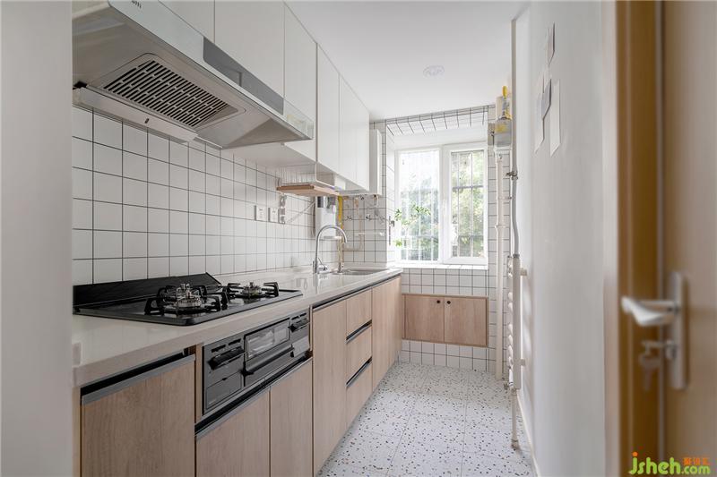 廚房空間櫥柜材質(zhì)是愛格板,地柜的木色小白磚加白色頂柜使空間干凈美觀。煙機灶臺是日本的一款比較適合不做爆炒的家庭。