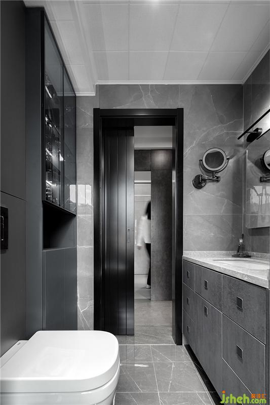 衛(wèi)生間墻地磚一體,均為灰色系,浴簾的使用能夠很好的劃分干濕區(qū)。利用墻體在洗手臺一側(cè)制作開放格,黑色玻璃作為隔板,節(jié)省了洗手臺不少的空間。