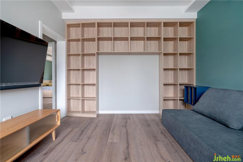 客廳區(qū)域利用埡口與墻之間的距離做了整面墻的定制柜開放格,可容納孩子大量的書籍,也可展示一些收藏,具有很強(qiáng)實(shí)用性。地面鋪貼了略帶結(jié)疤的實(shí)木地板,地板呈現(xiàn)出原始的紋理與顏色,體現(xiàn)出自然之美。