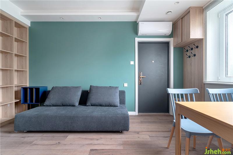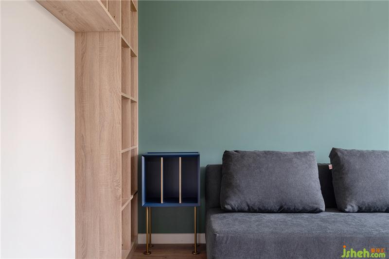 沙發(fā)背景墻涂刷了莫蘭迪色系墻漆,搭配深灰色沙發(fā)床給空間帶來寧靜祥和的氛圍。擺放在角落的深藍(lán)色邊幾小巧而獨(dú)立,具有收納能力的同時(shí)充斥一絲高級感。