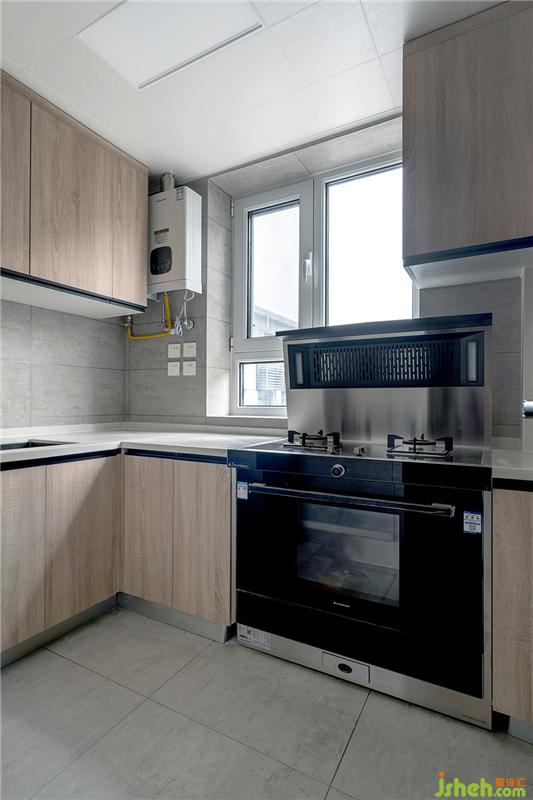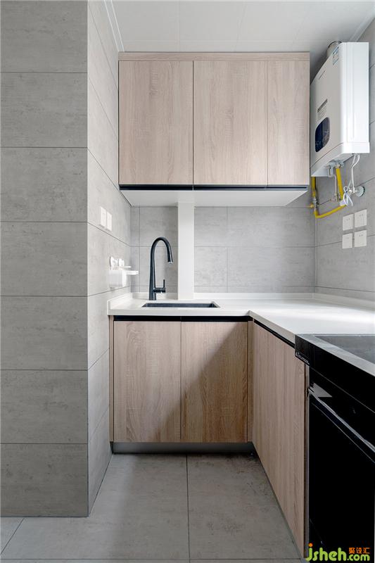 廚房采用高級灰的墻磚與原木色柜體相結合,搭配白色石英石臺面,使得風格更自然純樸。集成灶是小廚房的福音,它能夠省出不少的吊柜空間,非常劃算。