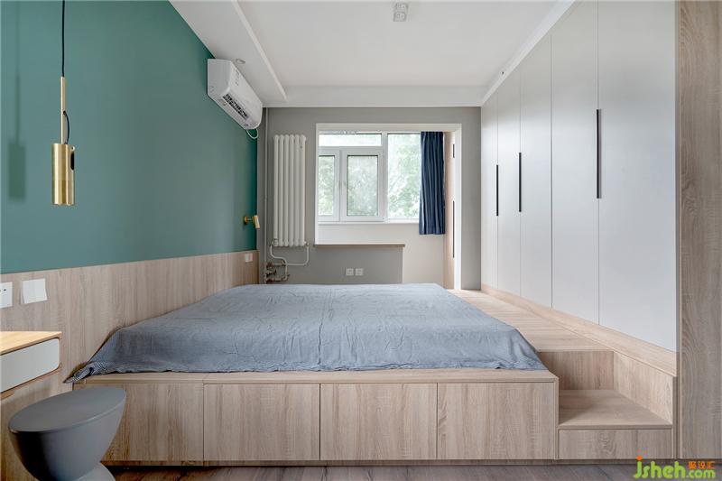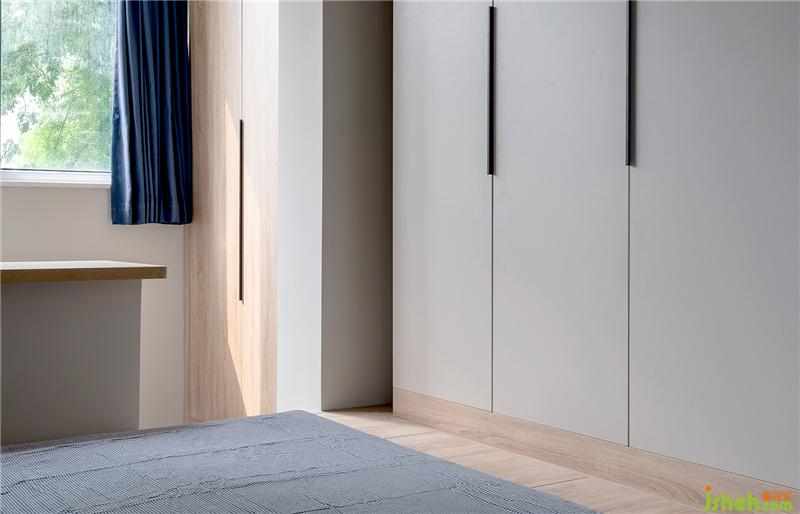 主臥定制了榻榻米地臺床,與衣柜相銜接,擁有海量的收納空間,完全解決了整屋的儲物問題。柜體選用隱藏拉手設計,由上拉和抽屜式開啟,使其更加整體。