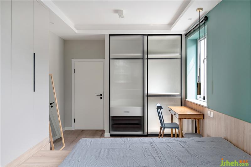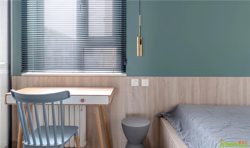 黑白灰加以木色,滿滿的北歐風令人感到寧靜祥和,床頭墻上方淺墨綠色的墻面為空間增加一抹亮色,作為空間的點綴。