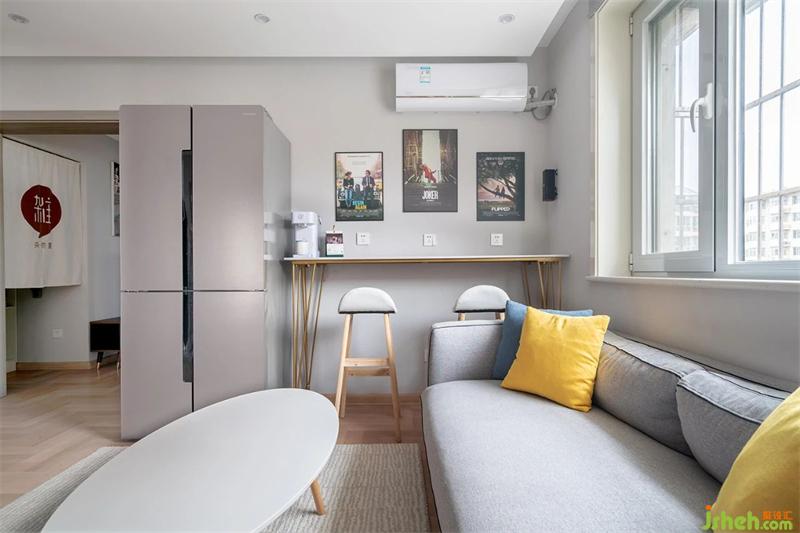 從落地?zé)舴较蛲膳_(tái)區(qū)看,把原來在廚房空間的冰箱挪到了客廳區(qū)域,并把原來的600的冰箱,更換成了910的冰箱增加了儲(chǔ)藏空間。