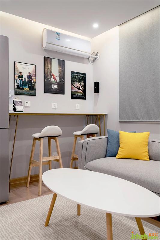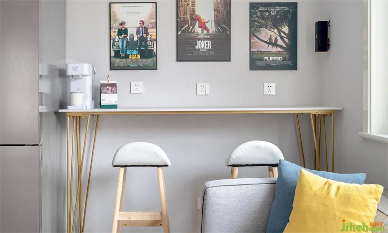 吧臺(tái)區(qū)域灰色墻面,墻面懸掛的都是屋主喜歡的電影宣傳海報(bào)。吧臺(tái)的材質(zhì)是金屬與石材的結(jié)合。