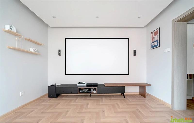 正面看幕布區(qū)域,墻面的幕布是固定在墻面上,沒有暗藏在吊頂內(nèi)部。電視柜選擇的是可拉伸式,能根據(jù)需求進(jìn)行伸縮。電視柜的抽屜,可以放一些客廳雜物,中間的開放格可以放機(jī)頂盒等設(shè)備。