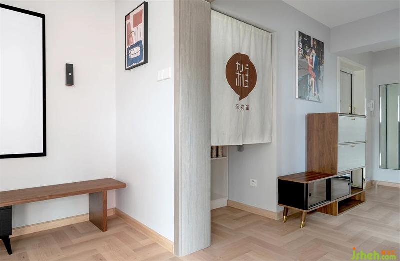 門廳區(qū)域入戶后在門的右手邊擺放了成品鞋柜,在門廳鞋柜上方是屋主自己繪畫形象照。原有的雜物間是封閉式的,打開后沒有足夠的活動(dòng)空間,所以雜物間區(qū)域就采用了布簾的方式,擴(kuò)大雜物間的活動(dòng)空間以及間接的擴(kuò)大了雜物間。