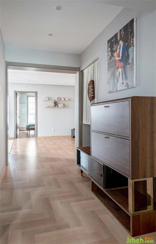 從門廳區(qū)域往客廳方向看,地面整體通鋪木地板,在視覺感上擴(kuò)大空間感。
