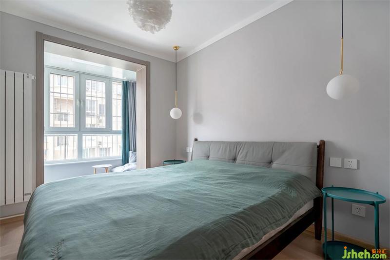 床頭沒有去做儲(chǔ)物空間,只是簡簡單單的做了夜晚可以擺放物品的臺(tái)面。