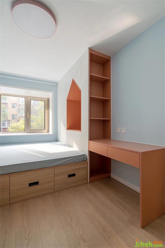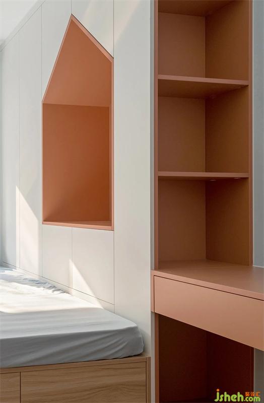 兒童房書桌還有敞開(kāi)格做了橙色,飽和度相對(duì)高一些,跟墻面做一個(gè)強(qiáng)烈的對(duì)比,激活空間。