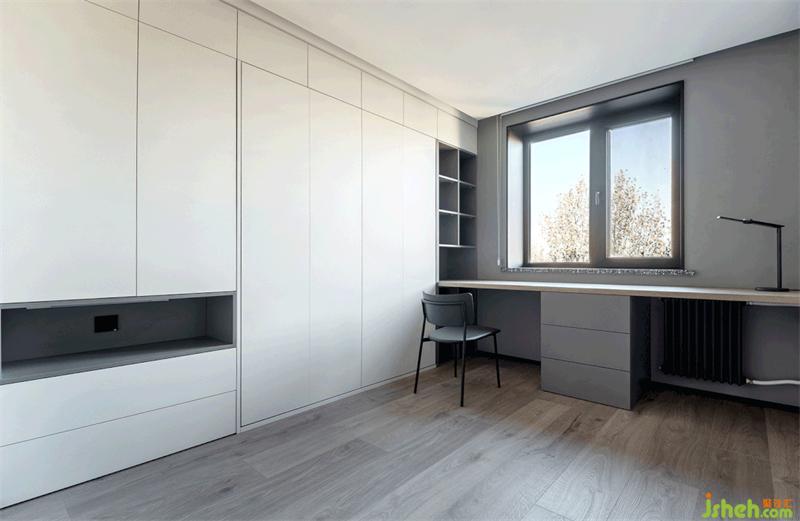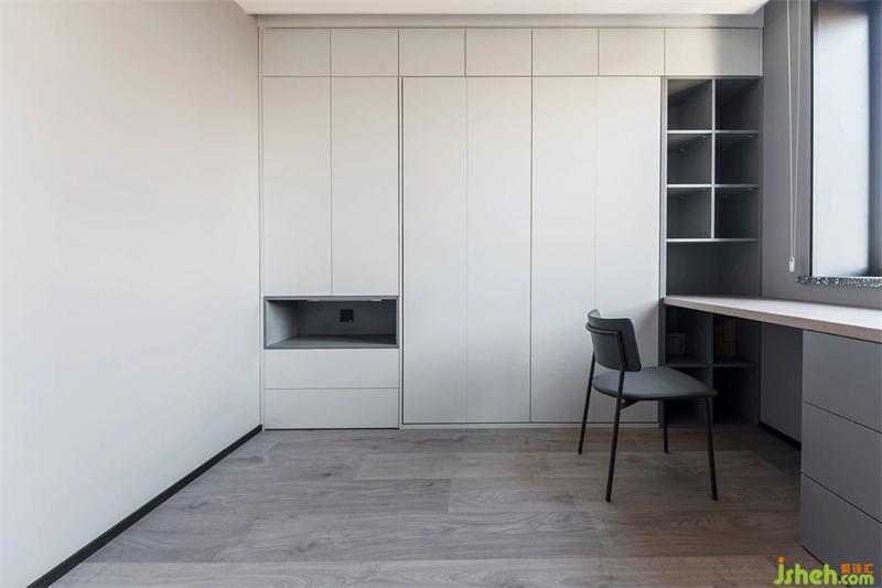 緊鄰辦公桌的部分利用開放格作為書架,整高收納柜存放冬季衣物。半高柜收納襯衫西裝等不能折疊的衣物,底部抽屜則存放貼身衣物。用井井有條的收納方式,提升生活的自由歸屬感。
