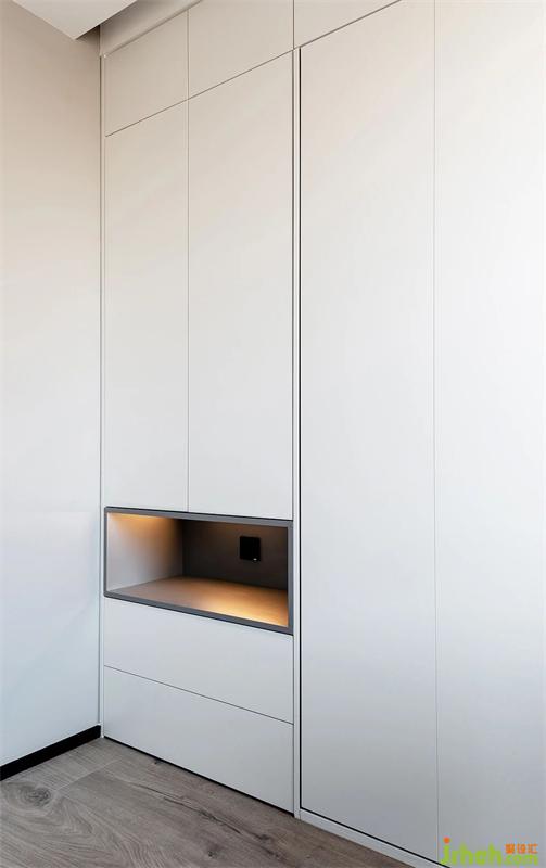 收納柜的左側(cè)預(yù)留了一個(gè)開放格,休息的時(shí)候可以客串床頭柜。內(nèi)部附有插座和隱藏光源,省去床頭燈的同時(shí)還能給手機(jī)充電。
