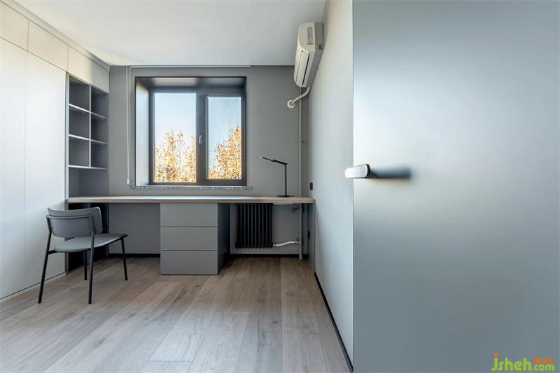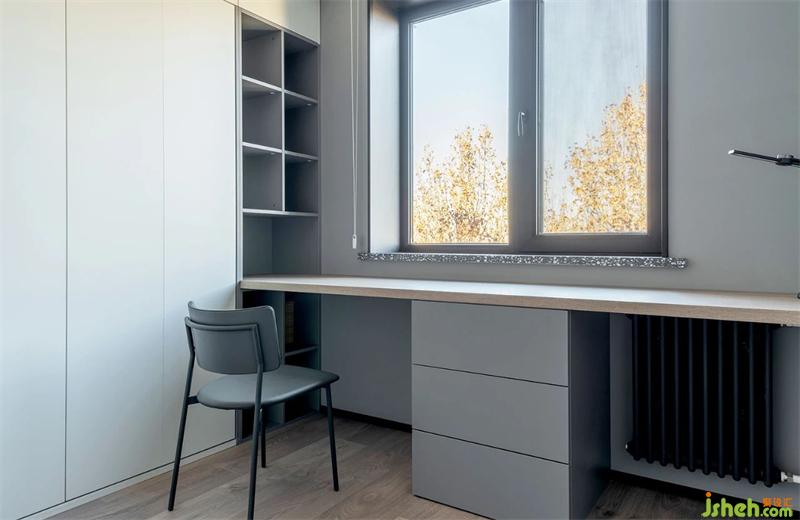 窗下是張橫跨整個(gè)空間的辦公桌,中間利用儲(chǔ)物柜作為支點(diǎn),不僅可以提升承重能力,還能滿足收納需求。辦公區(qū)雖然用顏色做了區(qū)分,但卻不會(huì)破壞整體的效果。
