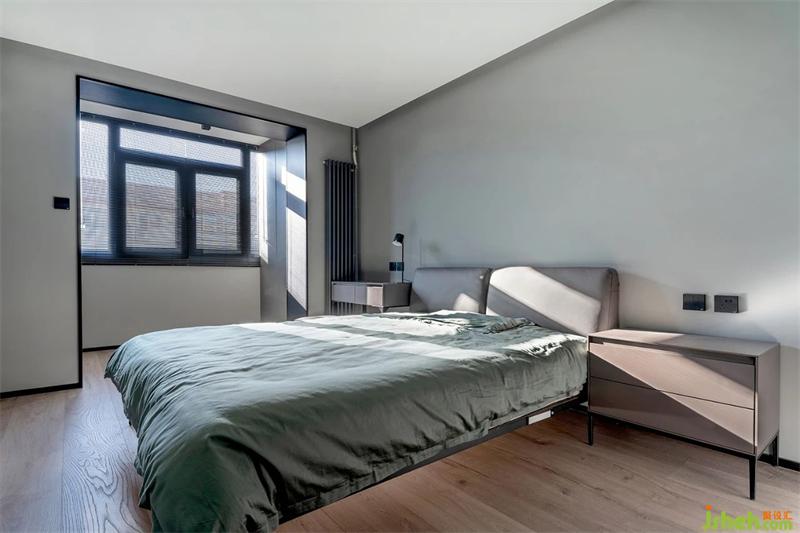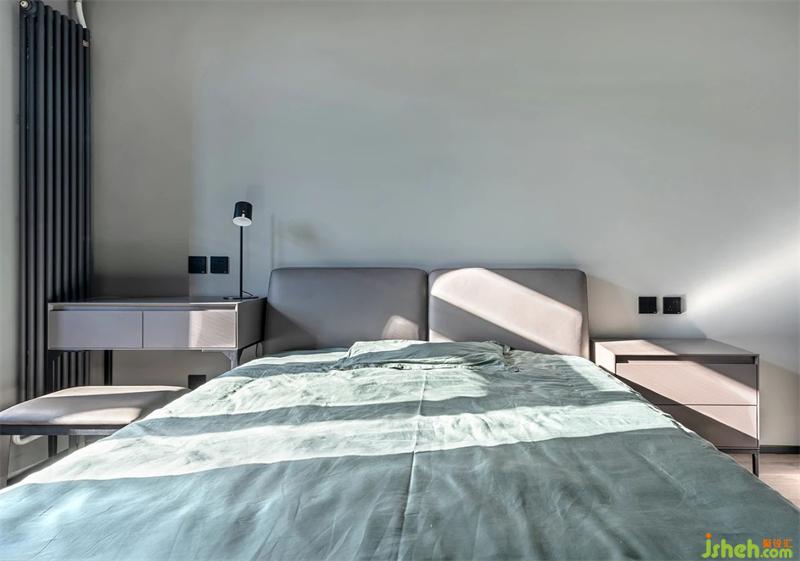 臥室整體選用了淺灰色,搭配灰色的家具床品,讓整體的空間顯得統(tǒng)一舒適。
