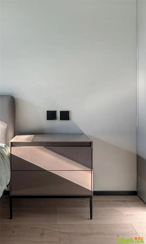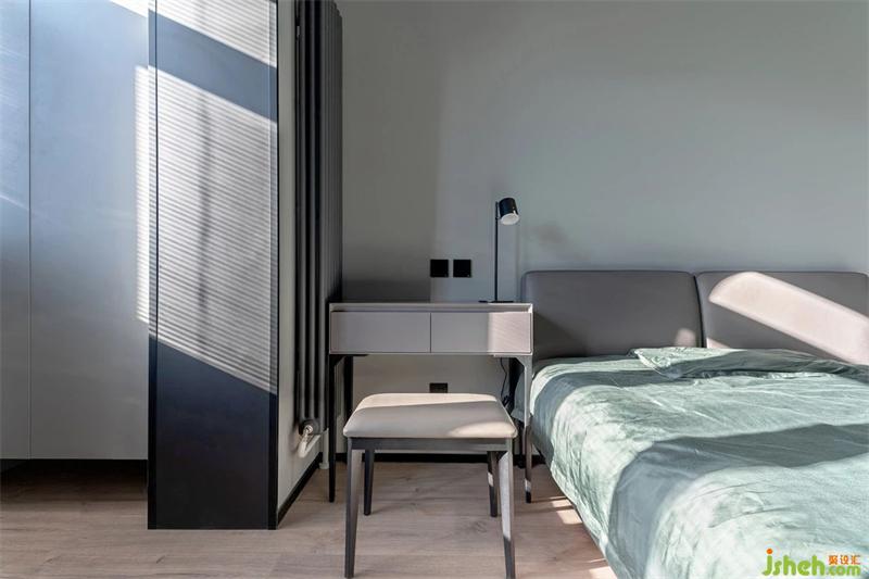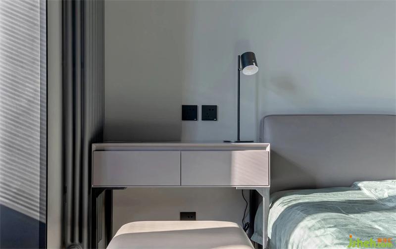 床頭左側(cè)舍去了床頭柜增加了梳妝臺(tái),淺灰的顏色與整體色調(diào)更為契合,絲毫不會(huì)產(chǎn)生突兀感。