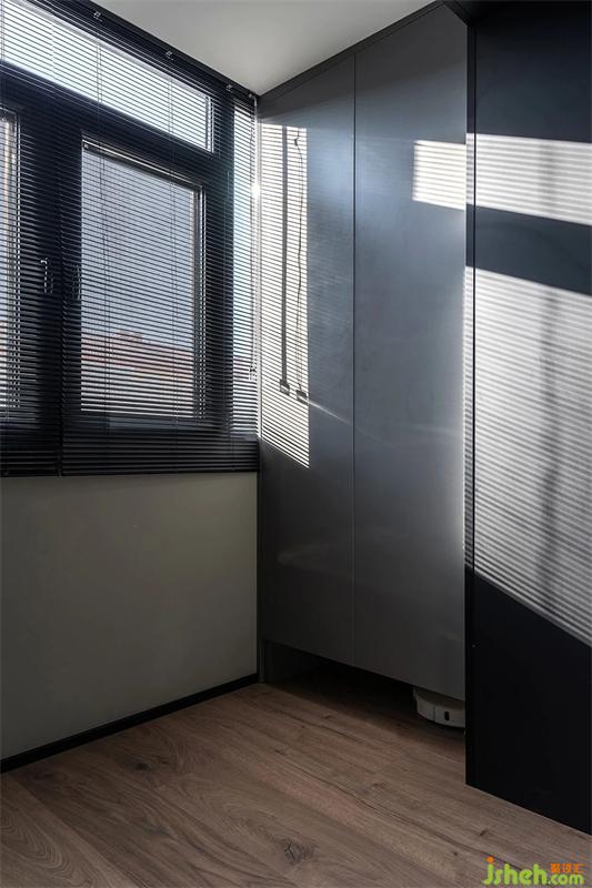 臥室陽臺(tái)選用了百葉簾,裝修設(shè)計(jì)既可以保證房間的私密性,又不會(huì)影響光線的進(jìn)入。陽臺(tái)的U型區(qū)域還增加一組整高的儲(chǔ)物柜,進(jìn)一步提升臥室的儲(chǔ)物功能,底部預(yù)留了一部分空間,用于存放掃地機(jī)器人,實(shí)現(xiàn)對(duì)空間的完美利用。