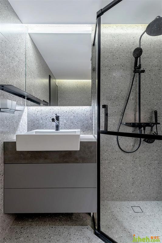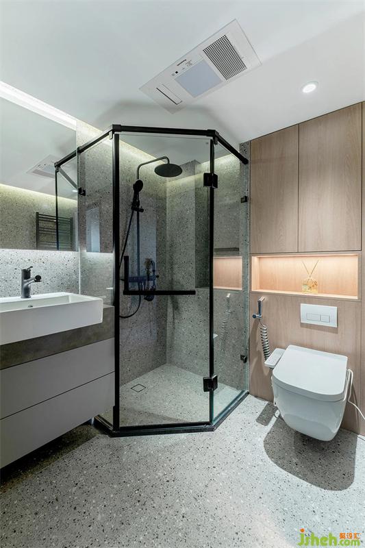 壁掛式馬桶的后面利用儲(chǔ)物柜將水箱進(jìn)行隱藏,頂部的柜子可以存放備用的洗浴用品。中間的開放格安裝了燈帶,可以幫助綠植進(jìn)行光合作用。也可以擺放香薰,清除空間異味。