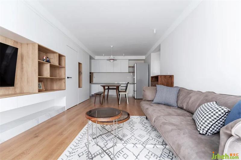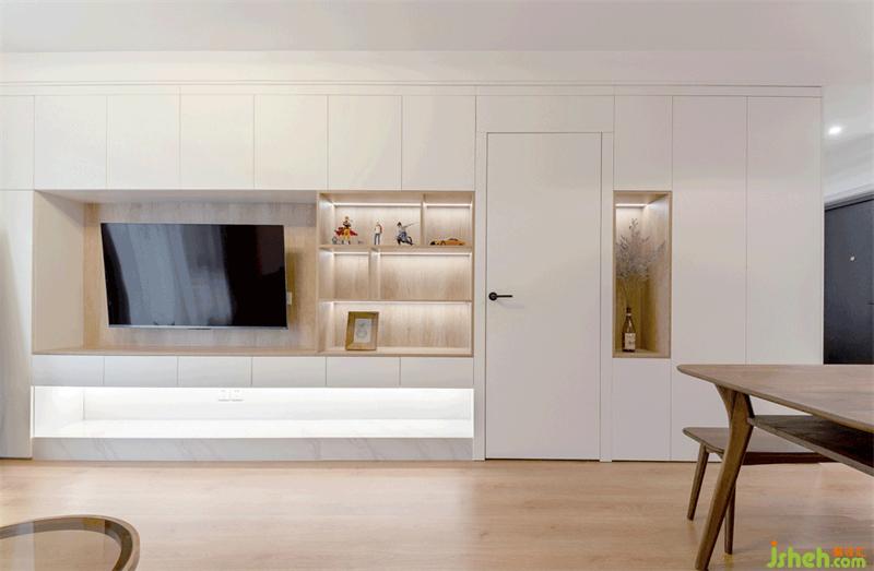 客廳增加了整排的綜合收納空間,并且與餐廳背景相連接。形成統(tǒng)一的視覺效果,延伸了空間感。