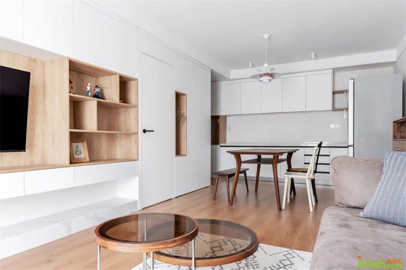 電視背景墻,放置65寸電視,旁邊并且放置手辦區(qū)域。天津裝修設(shè)計(jì)隱形門過渡客餐廳,讓空間完整統(tǒng)一。