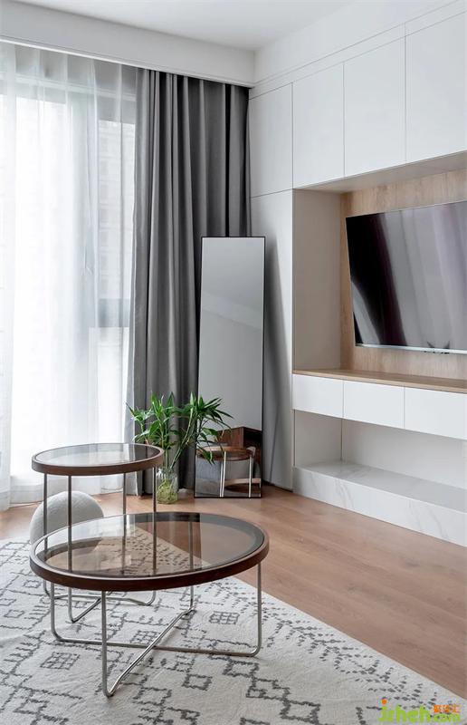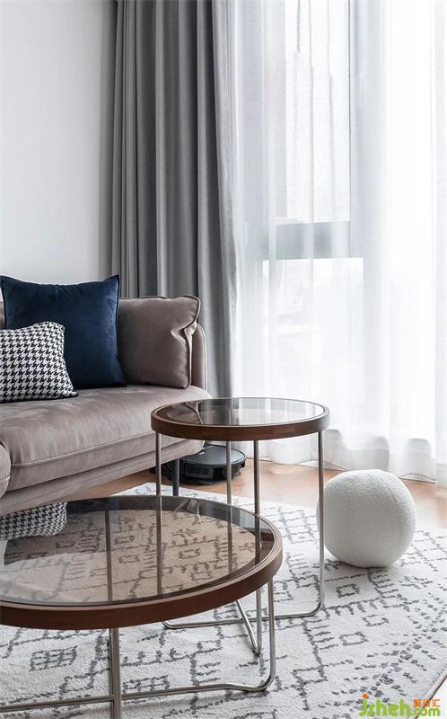 沙發(fā)旁放置了小邊幾,方便拿取和移動(dòng),玻璃材質(zhì)更顯得輕透。地毯和抱枕增加整體的溫柔感。