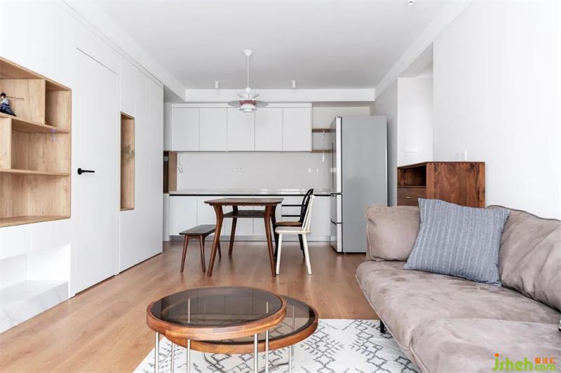餐廳形成環(huán)繞動(dòng)線,空間上更能放大。常走路的一側(cè)設(shè)置矮凳,方便通行,并且規(guī)避遮擋。