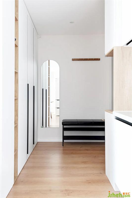 門廳增設(shè)衣帽鞋柜,掛衣區(qū),小件物品收納,天津裝修設(shè)計(jì)以及換鞋凳和穿衣鏡的空間,讓門廳功能更完善,使用更方便。