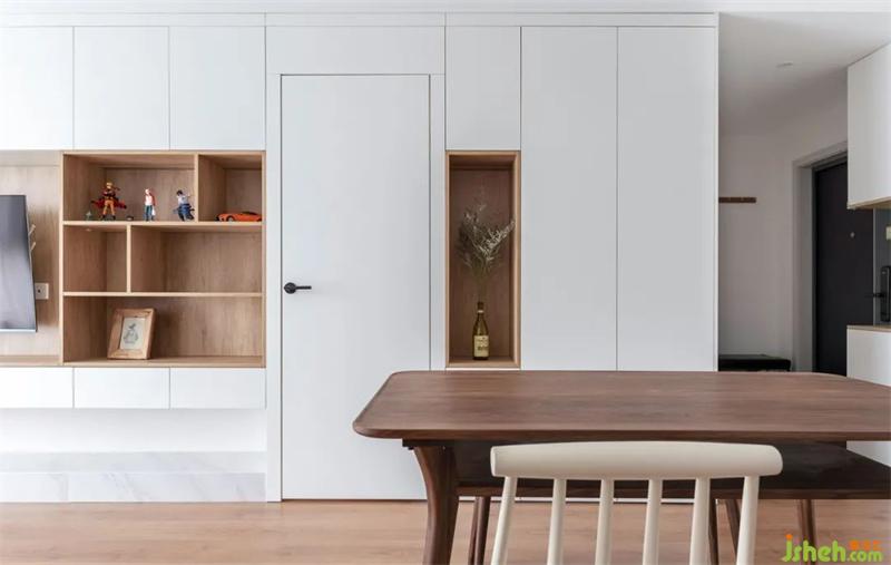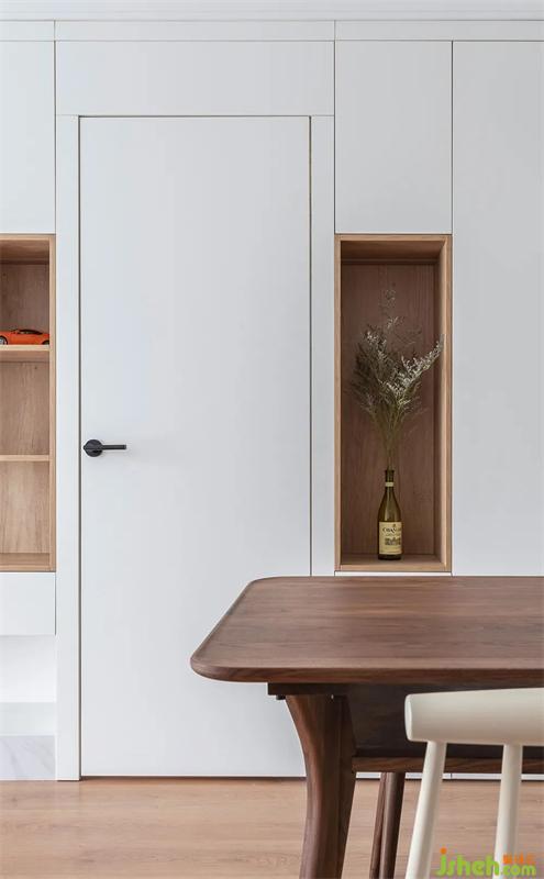 餐廳相對應(yīng)的收納柜,有藏有露。原設(shè)計(jì)是想放置大型樂高空間,無意之間放置了一個花瓶,比起樂高,使空間更加自然,更加有生機(jī)。開放格也做了套色,與電視墻相呼應(yīng)。