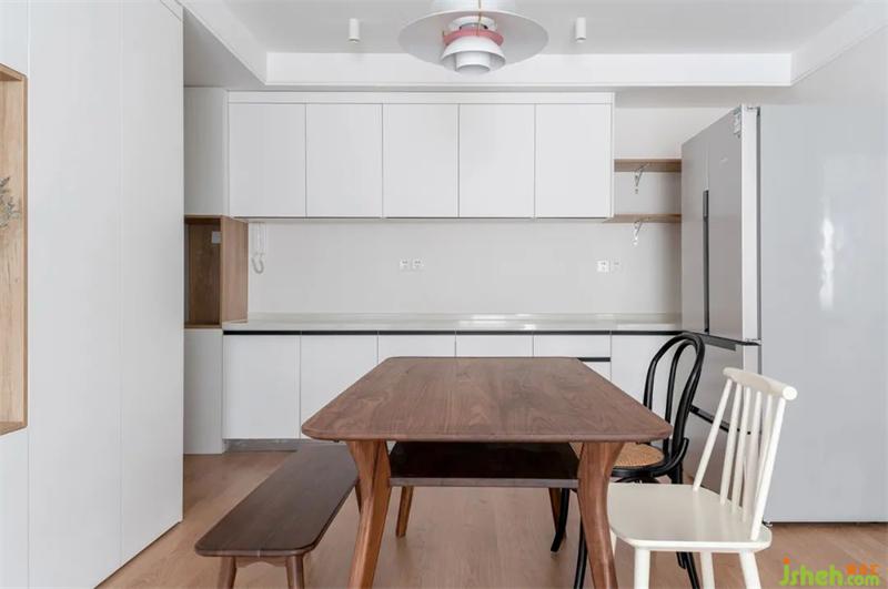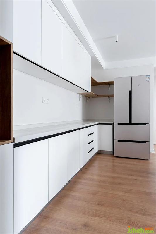 原有戶型為一字型櫥柜,天津裝修設(shè)計(jì)為了增加儲物和操作臺面,通過更改門洞位置,增加了一排櫥柜,更改為L型布局。為了阻隔油煙問題,增加一組長虹玻璃推拉門作為隔斷。