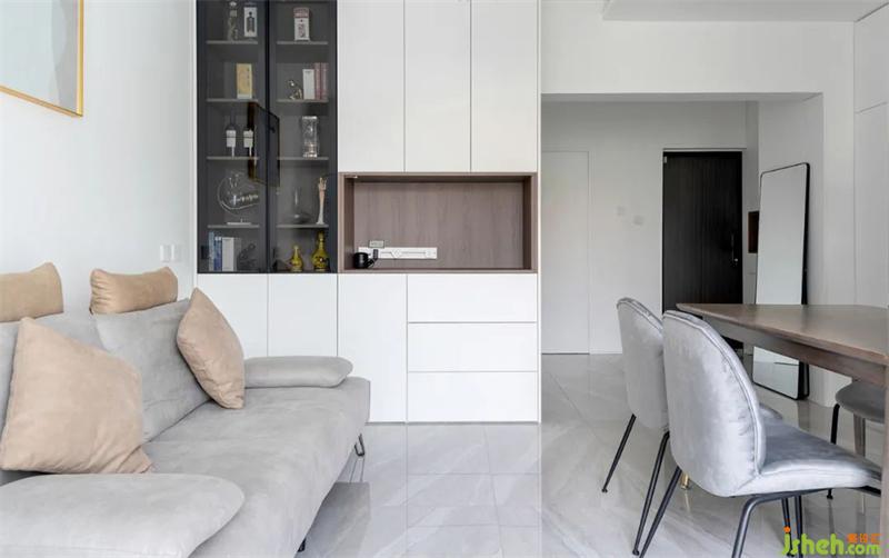 天津家居設(shè)計為保證空間整體層高,沒有做太多的吊頂。沙發(fā)的旁邊安排了一組收納,來滿足展示和備餐需求。暖灰色的亮光磚有放大空間的效果,營造簡潔隨意的氛圍。