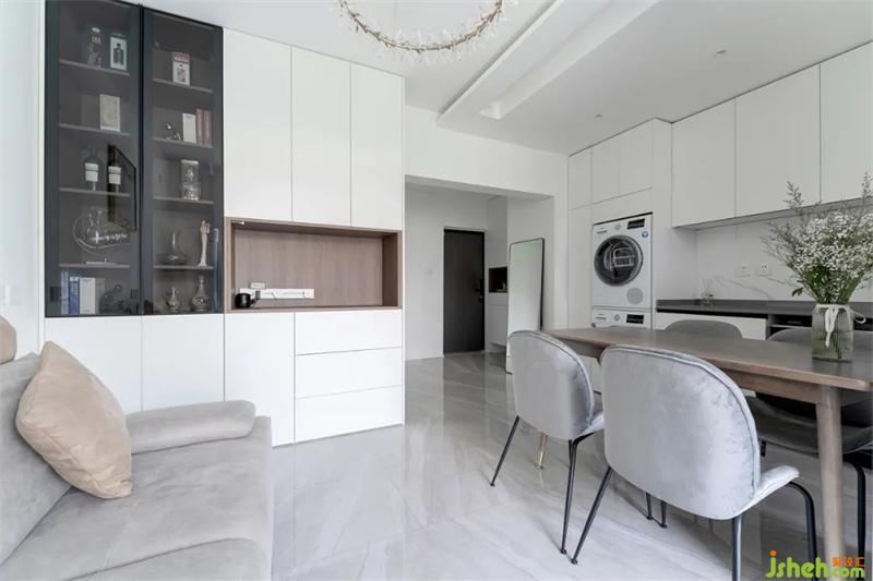 廚房入口的家政柜,內(nèi)嵌了洗衣機以及烘干機。旁邊是一整排操作臺和收納空間,讓使用功能上得到很好的銜接。