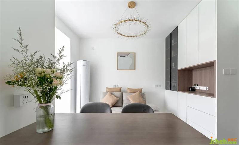 餐邊柜中的開放格,裝得下家里所有小家電,還能滿足雜物收納?;疑萍疾忌嘲l(fā)既可以防止貓抓,又不會像皮革一樣夏天容易黏皮膚。
