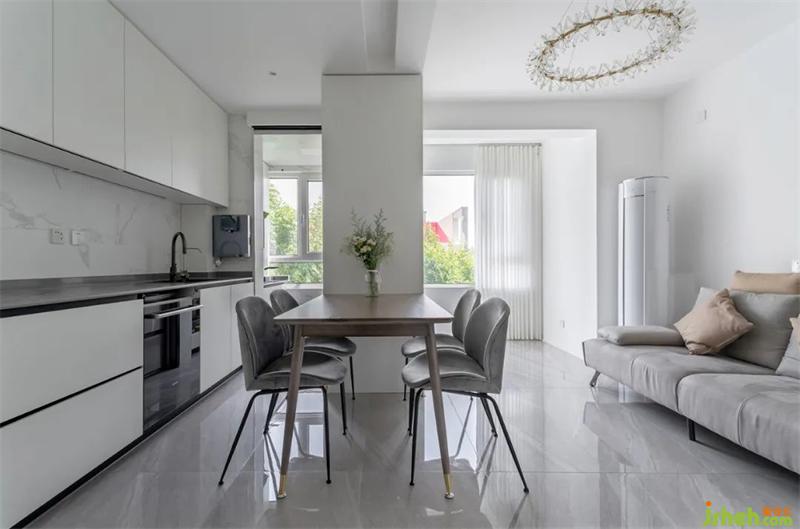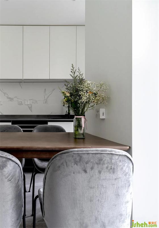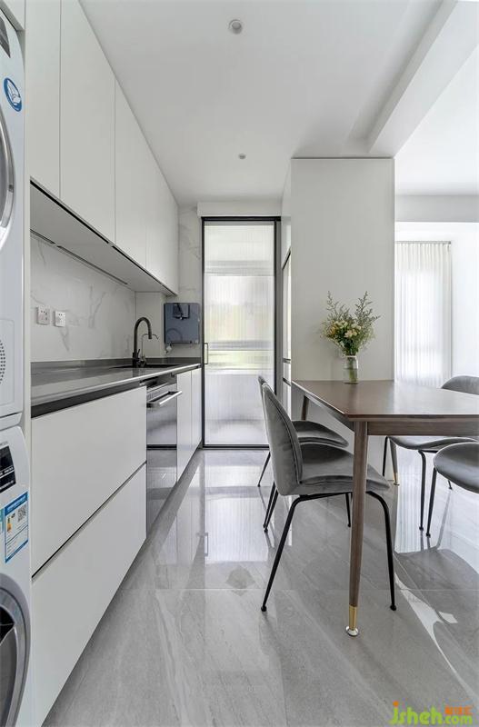 把煙機灶具外移到陽臺,還增加一墩廚房面積,極窄長虹玻璃移門隔絕油煙。爵士白墻磚與灰色啞光臺面,搭配白色愛格板櫥柜,潔白明亮的空間體現(xiàn)現(xiàn)代質(zhì)感。