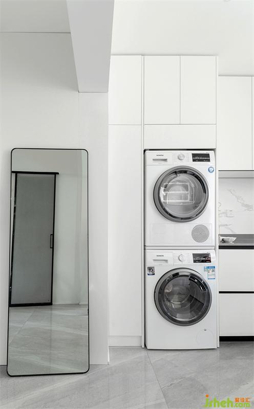 洗衣機烘干機做了內(nèi)嵌,與原結(jié)構(gòu)墻中間增加了一組家政柜,把好用的清潔工具都配齊了,功能豐富不浪費任何角落。